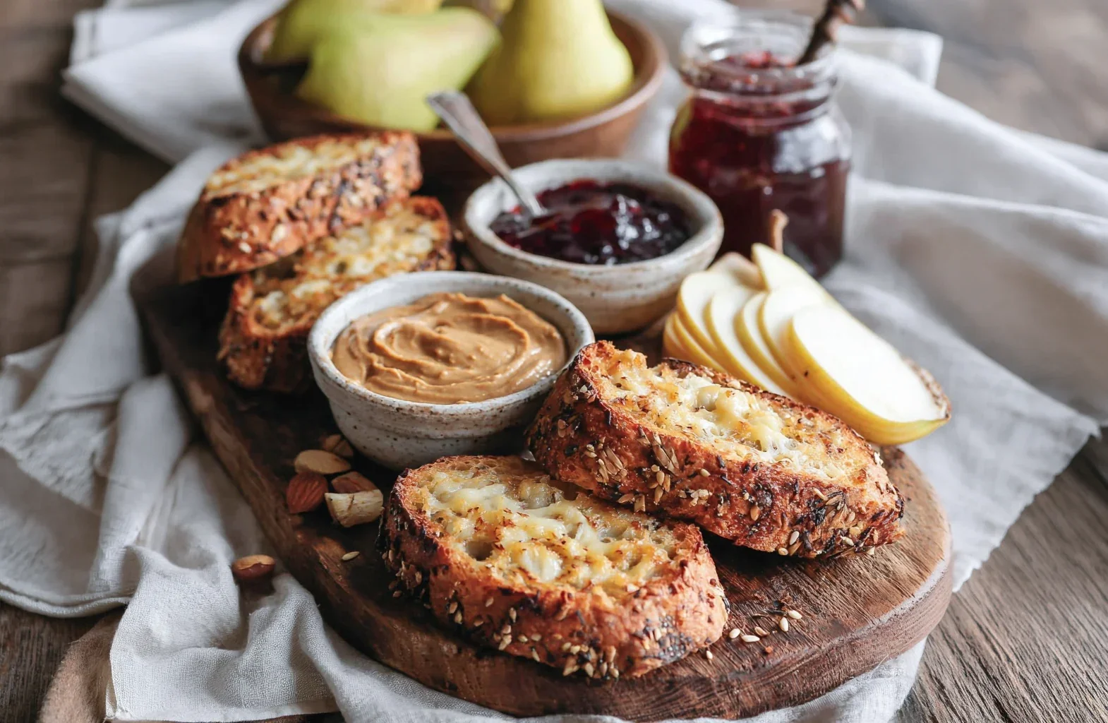 Thick-cut artisan bread with nut butters, house preserves, fresh toppings, and local honey. A generous breakfast board for two — the kind of spread that makes you want to stay another hour.